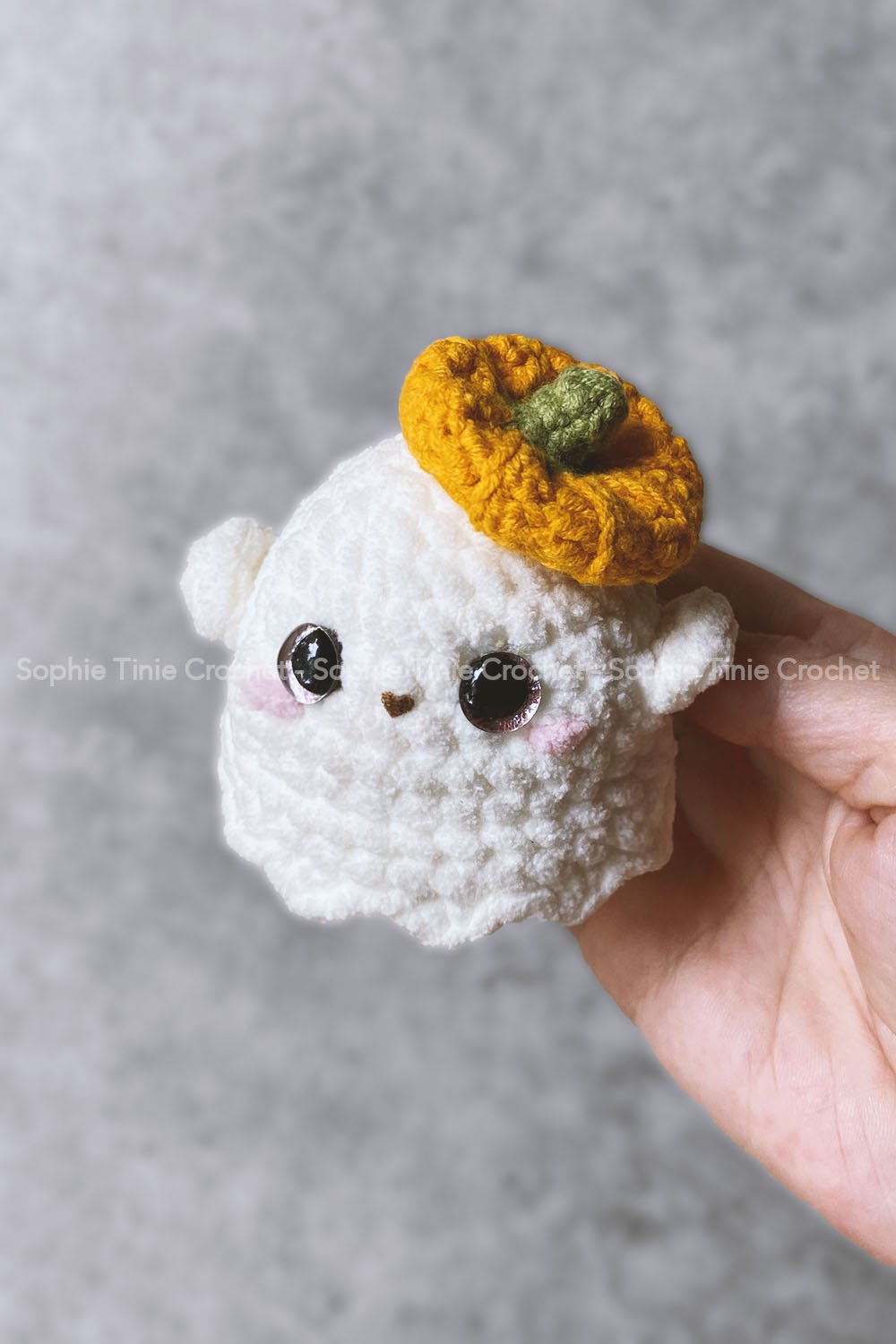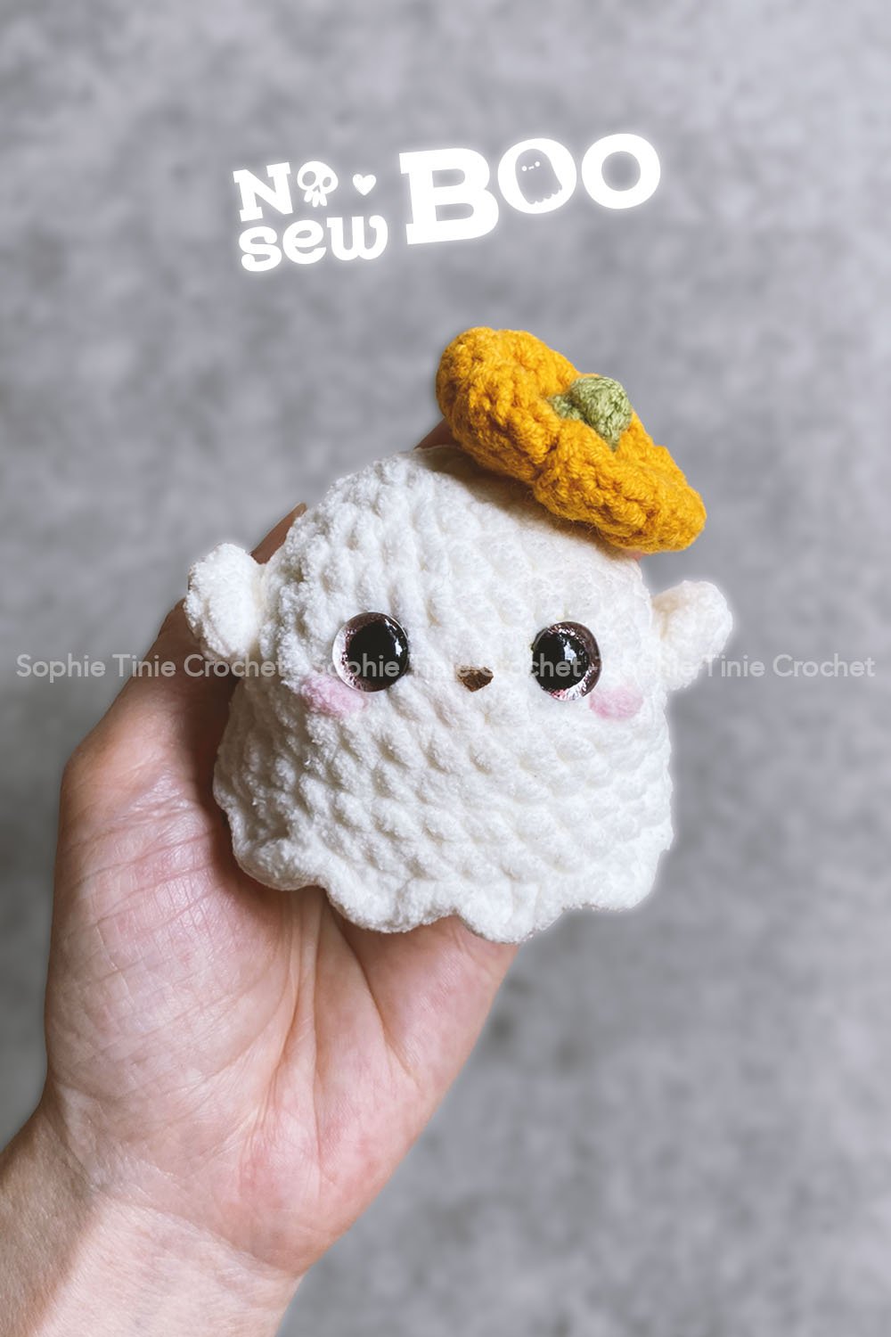 The finished Spooky Boo measures approximately 6.5cm (2.6 inches) tall. Size may vary depending on crochet tension and materials (yarn & hook) used.